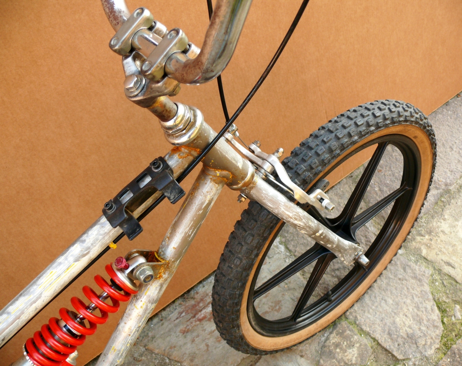 Va ser recollir el quadre, forquilla i basculant que feia setmanes que havia decapat i deixat estar, muntar un eix de pedalier de “quadradillo”, amb les boles i rodaments bruts de la grassa vella i tot. Així també el joc de direcció. Tot seguit vaig ajustar-hi la suspensió central, substituint el braç de suspensió d’origen per un de modern de BTT, de marca PRO-SHOCK, amb diversos reguladors de la tensió. No va ser fàcil adaptar forats i amplades. Aquest nou braç de suspensió és uns 5 cms més curt, i per això la geometria de la bici ha cambiat: la forquilla i el tub de direcció, així com el tub del seient, s'inclinen cap enrere, mentre que el pedalier baixa, perdent altura. Tant el manillarg com el seient estan lleugerament avançats, per reajustar una mica la posició damunt la bici.